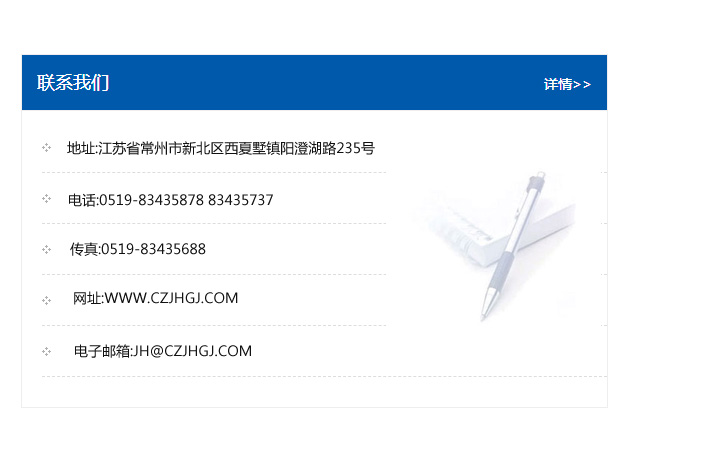 地址:常州市新北區友邦商務大廈1幢16、17層  電話:0519-85101652  傳真:0519-85112595  郵編:213022  網址:www.cz-jiayue_cn.xinkuwan.com  郵箱:xiajifengaa@163.com
